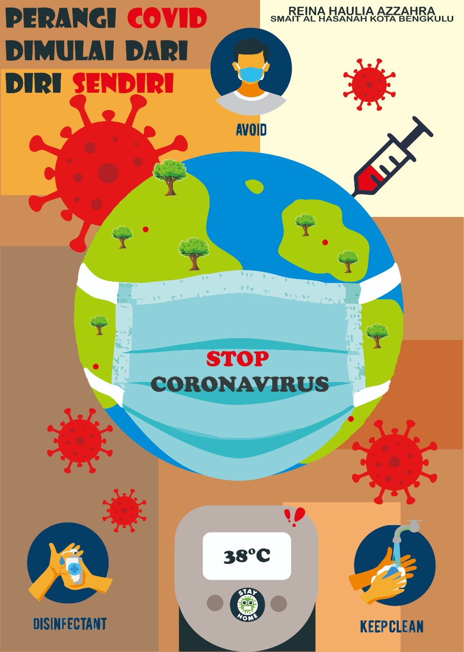 Poster yang dibuat ananda Reina memuat pesan agar masyarakat untuk berperang dengan Covid-19 dan bisa dimulai dari diri sendiri. Gambar virus yang ada di sekeling bumi itu menunjukkan bahwa saat ini virus itu masih menyebar di setiap tempat. Sementara gambar masker pada lingkaran bumi mengajak masyarakat untuk selalu memakai masker di mana pun berada. Selanjutnya, gambar jarum suntik bermakna ajakan untuk mengikuti vaksinasi yang diselenggrakan oleh pemerintah dan senantiasa mencuci tangan dengan cara yang benar serta jika suhu tubuh tinggi atau demam sebaiknnya tetaplah di rumah.