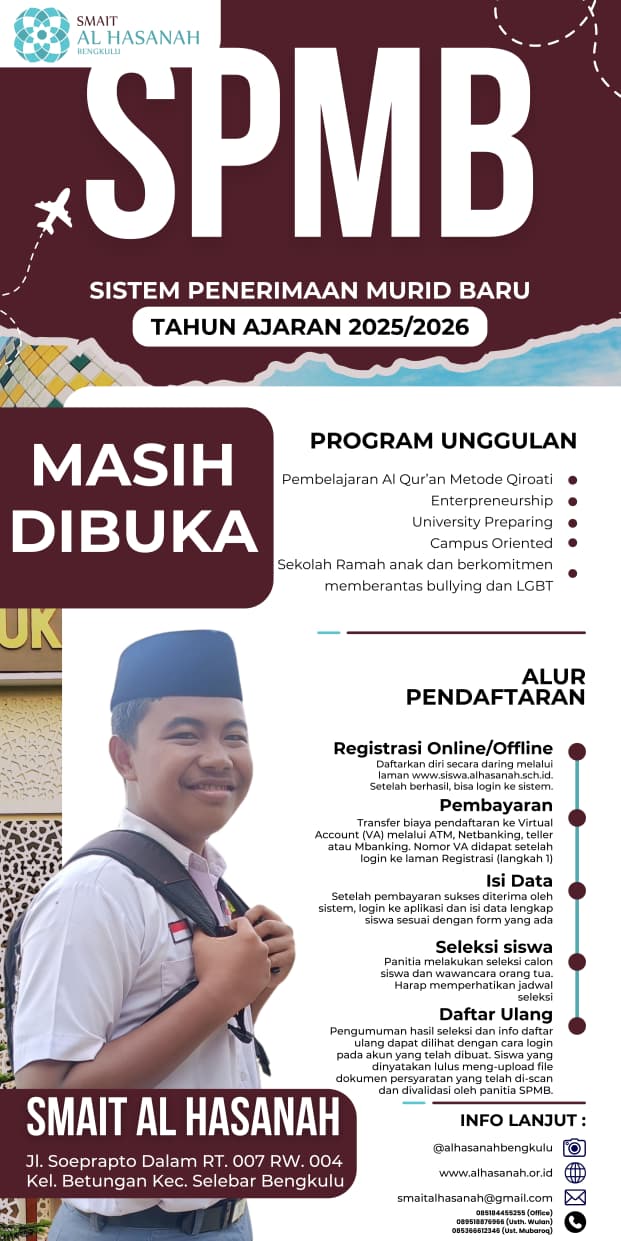 Penerimaan murid baru di SMAIT Al Hasanah untuk tahun ajaran 2025/2026 telah dibuka. Informasi ini cocok untuk calon siswa, orang tua dan keluarga yang ingin menyekolahkan putra putri mereka di sekolah yang berbasis islam dan teknologi khususnya di kota Bengkulu.